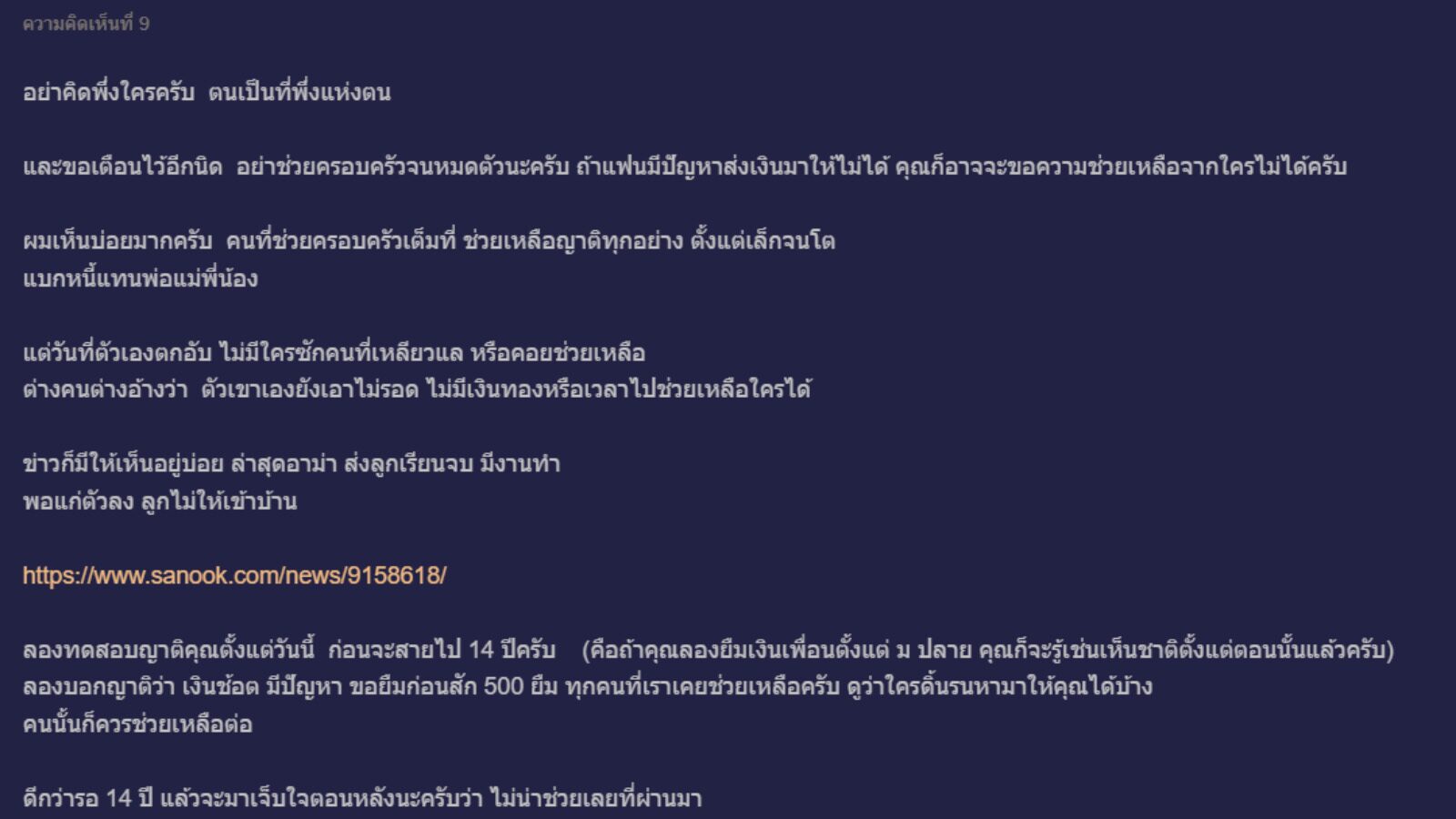 สิ่งที่เกิดขึ้นเจ้าของกระทู้ควรทบทวนให้ดี ๆ ว่า ยังอยากเป็นเพื่อนกันอยู่หรือไม่ หากรักและแคร์เพื่อนมากก็ควรไปอธิบายเหตุผลที่ต้องยืมเงินให้เข้าใจ และที่สำคัญเจ้าของกระทู้อย่าเพิ่งช่วยครอบครัวจนหมดตัว เพราะหากแฟนมีปัญหาไม่สามารถส่งเงินมาให้ อาจจะหมดหนทาง พึ่งพาใครไม่ใด้เช่นกัน