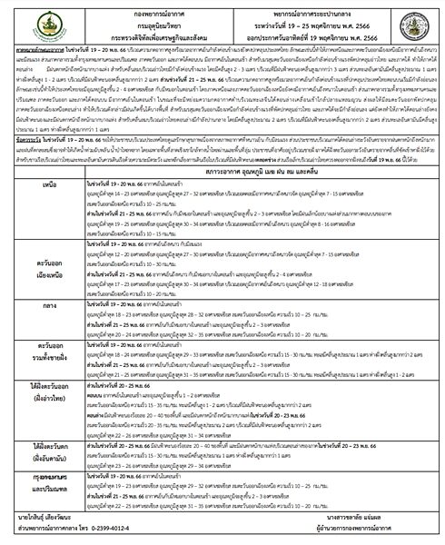ส่วนในช่วงที่ 21-25 พ.ย. 66 อากาศเย็นกับมีหมอกบางในตอนเช้า และอุณหภูมิจะสูงขึ้น 2-3 องศาเซลเซียส อุณหภูมิต่ำสุด 22-25 องศาเซลเซียส อุณหภูมิสูงสุด 31-35 องศาเซลเซียส ลมตะวันออกเฉียงเหนือ ความเร็ว 10-20 กม./ชม.
