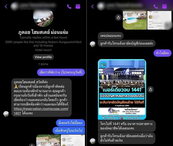 ต่อมาไม่สามารถติดต่อเเอดมินเพจได้ และทราบภายหลังว่า มีมิจฉาชีพแอบอ้างเพจของโฮมสเตย์แห่งนี้ เพื่อหลอกลวงผู้เสียหายโอนเงินไปหลายรายแล้ว เบื้องต้นพนักงานสอบสวนจึงรับแจ้งความไว้เพื่อดำเนินการตามกฎหมายต่อไป
