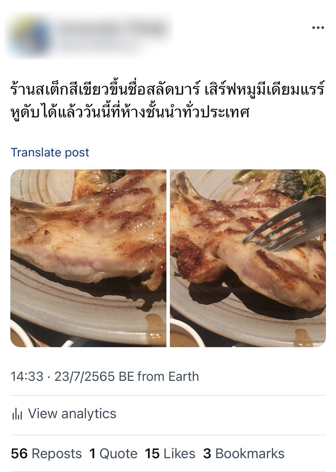 พร้อมเขียนแคปชั่นว่า "เอางี้ ทุกคนไม่ว่าจะนายทุนหรือร้านเล็ก ควรเข้าใจก่อนว่า หมูมันไม่สามารถเลือกระดับความสุกได้ จะมีดงมีเดียมอะไร๊! มันต้องสุก สุกโอนลี่ ยูโน๊ว!? จากใจคนที่เคยโดนร้าน (ร้านอื่น) บอกว่าย่างแบบมีเดียมให้ เพราะกลัวเนื้อแข็ง"