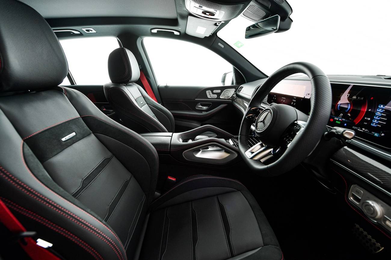 ภายในห้องโดยสารมาพร้อม AMG Interior Package มอบรายละเอียดการตกแต่งที่โดดเด่นตามสไตล์สปอร์ตในทุกองค์ประกอบ ไม่ว่าจะเป็น พวงมาลัย AMG Performance steering wheel พร้อมระบบพวงมาลัย AMG Steering 3 สเตจ หลังคากระจก Panoramic Sunroof ที่ช่วยเพิ่มความโปร่งสบายให้กับห้องโดยสาร