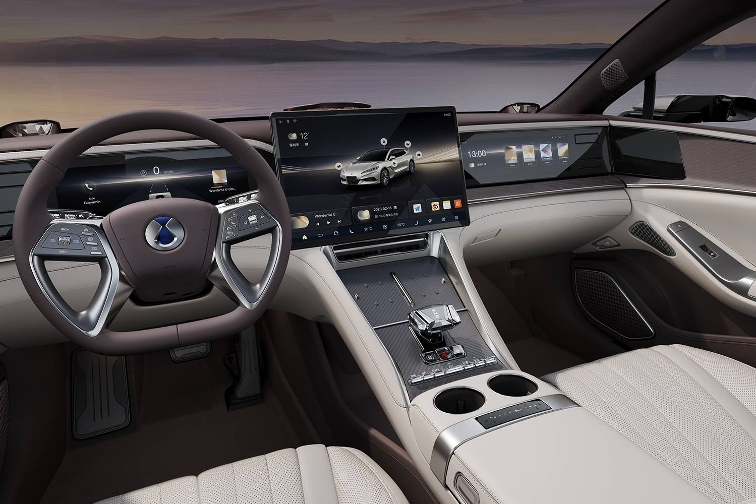 สมสง่าลักชัวรีเทียบชั้นรถยุโรปในแบบ DENZA 2.0 cockpit designสวยสง่าและลักชัวรีกับแผงคอนโซลหน้าดีไซน์ติดตั้งระบบจอด้วยกันถึง 4 จอประกอบด้วยชุดมาตรวัดดิจิทัลแบบ LCD 12.3 นิ้ว จอสัมผัสเชื่อมต่อระบบความบันเทิงขนาดใหญ่แบบลอยตัว 17.3 นิ้ว มีจอสำหรับฝั่งผู้โดยสารขนาด 10.25 นิ้ว และจอแสดงข้อมูลการขับขี่เหนือคอนโซลหน้าหรือ HUD พร้อมจอแสดงควบคุมระบบปรับอากาศด้านหลัง พวงมาลัยมัลติฟังก์ชัน 4 ก้านปาดล่างแบบ flat-bottomed คอนโซลกลางมีหัวคันเกียร์ไฟฟ้าเป็นคริสตั