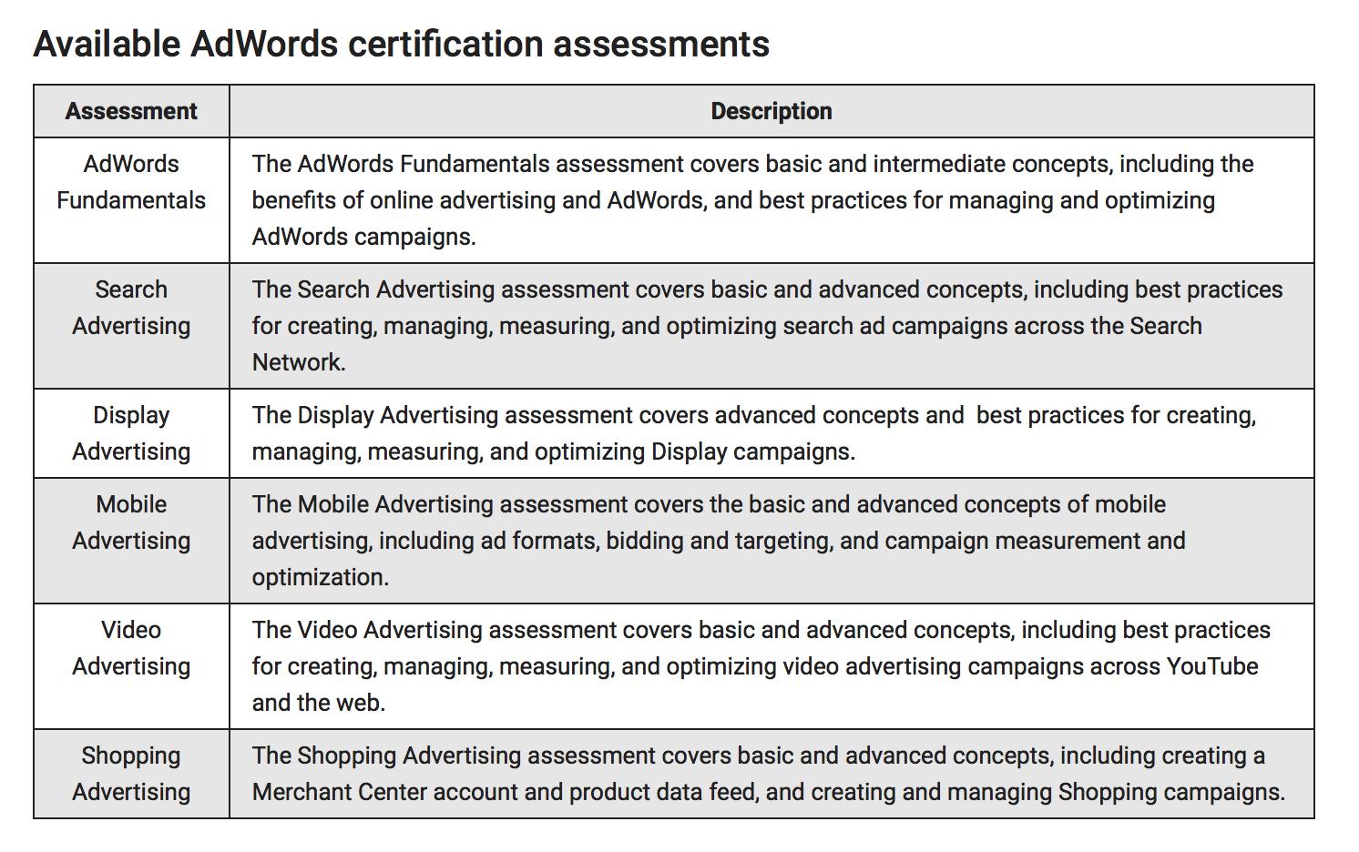 1. Google Adwords Certificate : การทำการตลาดที่สำคัญอย่างมากคือการที่สามารถทำ SEM ได้เป็นอย่างดี ซึ่งทำให้หลาย ๆ คนมักจะหาคนที่ทำ Adwords หรือวิเคราะห์ว่าจะใช้ Keyword อะไรในการทำการตลาดได้ขึ้นมาในการค้นหา ซึ่ง Google Adwords นั้นในความจริงแล้วมีระบบเอกสารและวิธีการสอนต่าง ๆ มากมายทั้งใน Google Adwords เองและใน Youtube ให้เข้าไปศึกษาและหาความรู้เอาเอง