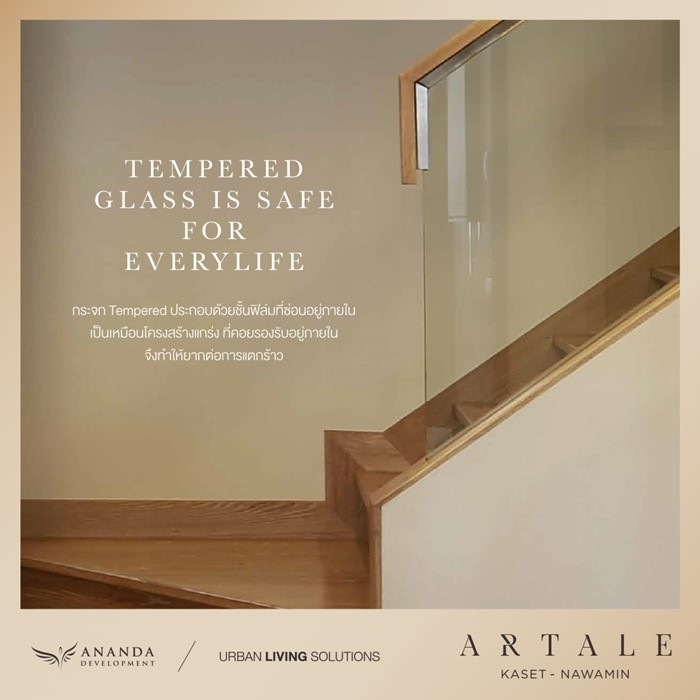 จุดขายอีกอย่างหนึ่งของ Artale Kaset-Nawamin ก็คือ การโชว์ความโดดเด่นของ Material เช่น ประตูหน้าบ้านไม้สัก กระจก Tempered ที่แข็งแกร่งยากต่อการแตกร้าว จากชั้นฟิล์มที่ซ่อนอยู่ภายใน พื้นเอ็นจิเนียร์วู้ดไส้กลางเป็นแผ่นไม้ ให้ความทนน้ำได้ดีกว่า HDF ทั่วไปแถมยังให้ความรู้สึกนุ่มนวลในการสัมผัส
