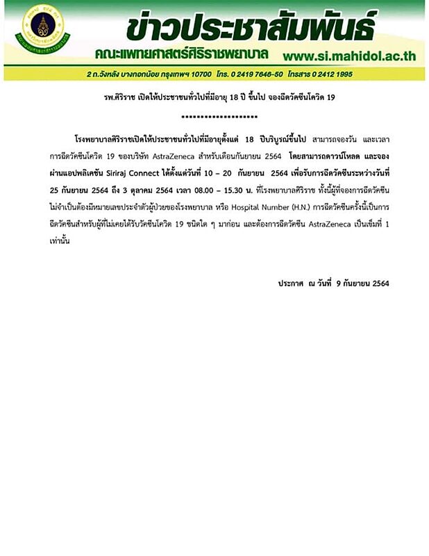 วันที่ 10 ก.ย.2564 ผู้สื่อข่าวรายงานว่า โรงพยาบาลศิริราช เปิดให้ประชาชนทั่วไปที่มีอายุตั้งแต่ 18 ปีบริบูรณ์ขึ้นไป สามารถจองวัน และเวลาการฉีดวัคซีนโควิด 19 ของบริษัท AstraZeneca สำหรับเดือนก.ย.2564 โดยสามารถดาวน์โหลด และจองผ่านแอพพลิเคชัน Siriraj Connect ได้ตั้งแต่วันที่ 10-20 ก.ย.2564 เพื่อรับการฉีดวัคซีนระหว่างวันที่ 25 ก.ย.-3 ต.ค.2564 เวลา 08.00-15.30 น. ที่โรงพยาบาลศิริราช