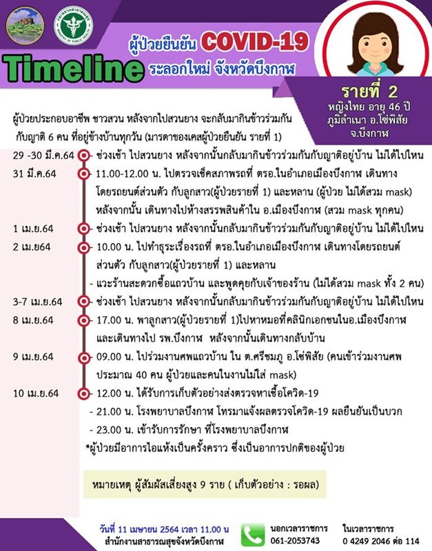 ส่วนรายของหญิงสาว จาก อ.ท่าอุเทน จ.นครพนม มารับประทานอาหารที่ร้านอาหารชลลดา ปลาเผา ซึ่งมากับเพื่อนๆ ประมาณ 22 คน หลังกลับไปทำงานที่ กทม. ตรวจพบติดเชื้อโควิด-19 ซึ่งไทม์ไลน์ได้มาเล่นน้ำที่หาดคำสมบูรณ์และรับประทานอาหารที่ร้านชลลดา ปลาเผา ในวันที่ 6 เม.ย. วันที่ 7 เม.ย.กลับ กทม. วันที่ 8 เม.ย.มีไข้ คอแห้ง เจ็บคอ ผลตรวจติดเชื้อโควิด-19