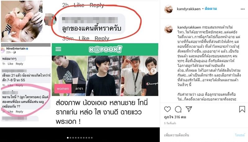ไม่ได้อยากปิดบังต้องอ่านให้จบ! - โซเชียลแห่แชร์ภาพความหล่อ น้องเอเอ หลานชาย โทนี่ รากแก่น ทำเอา แคนดี้ รากแก่น พี่สาว ออกมาโพสต์สุดพีคมากๆว่า “กระแสแรงจนต้านไม่ไหว..ไม่ได้อยากจะปิดบังนะคะ..แต่แค่ยังไม่ถึงเวลา..การมีลูกไม่ใช่เรื่องหน้าอาย แต่บางทีก็แค่อยากมีพื้นที่ส่วนตัวให้เด็กๆ