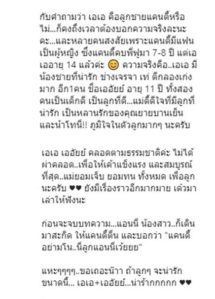 กับคำถามว่า เอเอ คือลูกชายแคนดี้หรือไม่…ก็คงถึงเวลาต้องบอกความจริงละนะคะ…และหลายคนสงสัยเพราะแคนดี้มีแฟนเป็นผู้หญิง ซึ่งแคนดี้คบพี่ฟูมา 7-8 ปี แต่เอเออายุ 14 แล้วค่ะ ?? ความจริงคือ..เอเอ มีน้องชายที่น่ารัก ช่างเจรจา เท่ ตีกลองเก่งมาก อีก1คน ชื่อเออัยย์ อายุ 11 ปี ทั้งสองคนเป็นเด็กดี เป็นลูกที่ดี…แม่ดี้ดีใจที่มีลูกที่น่ารัก เป็นหลานรักของคุณยายบานเย็น และน้าโทนี่!! ภูมิใจในตัวลูกมากๆ นะครับ