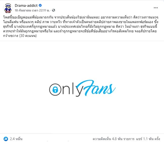 จากกรณีตำรวจไซเบอร์ตามจับกุม "น้องไข่เน่า" ดางดังแห่ง OnlyFans พร้อมแฟนหนุ่มคาโรงแรมในจ.สมุทรปราการ โดยก่อนหน้านี้น้องไข่เน่าออกมาประกาศเลิกทำคอนเทนต์ผ่าน OnlyFans ก่อนตามมาด้วยกระแสวิพากษ์วิจารณ์ ต่อมาวันที่ 18 ก.ย. เพจดังอย่าง Drama-addict ออกมาโพสต์เชิญชวนคนมาร่วมแสดงความคิดเห็น เกี่ยวกับ OnlyFans และการทำคอนเทนต์แนววาบหวิว ซึ่งธุรกิจนี้บางประเทศถูกกฏหมายแล้ว บางประเทศเช่นไทยก็ยังไม่ถูกกฏหมาย