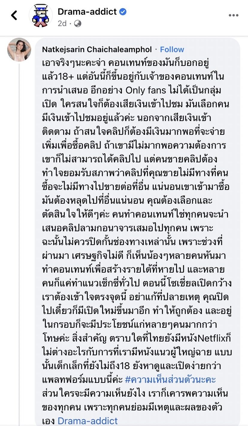 "เอาจริงๆนะคะจ่า คอนเทนต์ของมันก็บอกอยู่แล้ว18+ แต่อันนี้ขึ้นอยู่กับเจ้าของคอนเทนต์ในการนำเสนอ อีกอย่าง Only fans ไม่ได้เป็นกลุ่มเปิด ใครสนใจก็ต้องเสียเงินเข้าไปชม มันเลือกคนมีเงินเข้าไปชมอยู่แล้วค่ะ นอกจากเสียเงินเข้าติดตาม ถ้าสนใจคลิปก็ต้องมีเงินมากพอที่จะจ่ายเพิ่ม เพื่อซื้อคลิป ถ้าเขามีไม่มากพอความต้องการเขาก็ไม่สามารถได้คลิปไป แต่คนขายคลิปต้องทำใจยอมรับสภาพว่าคลิปที่คุณขายไม่มีทางที่คนซื้อจะไม่มีทางไปขายต่อที่อื่น แน่นอนเขาเข้ามาซื้อมันต้องหลุดไปที่อื่นแน่นอน คุณต้องเลือกและตัดสินใจให้ดีๆ ค่ะ"
