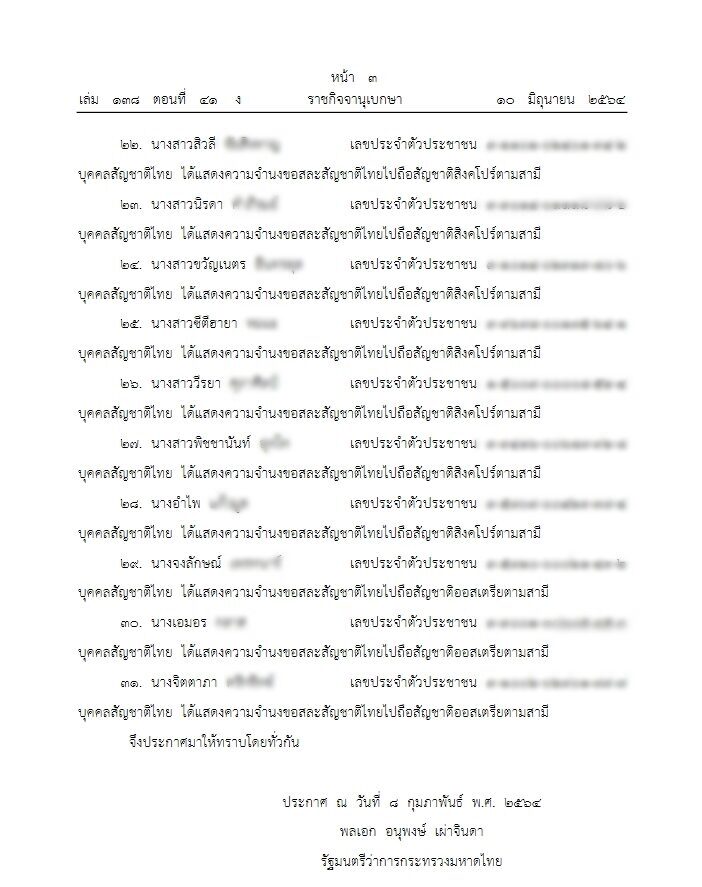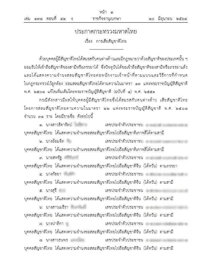 ราชกิจจานุเบกษา เผยแพร่ประกาศ 31 คนไทย ขอสละสัญชาติไทย