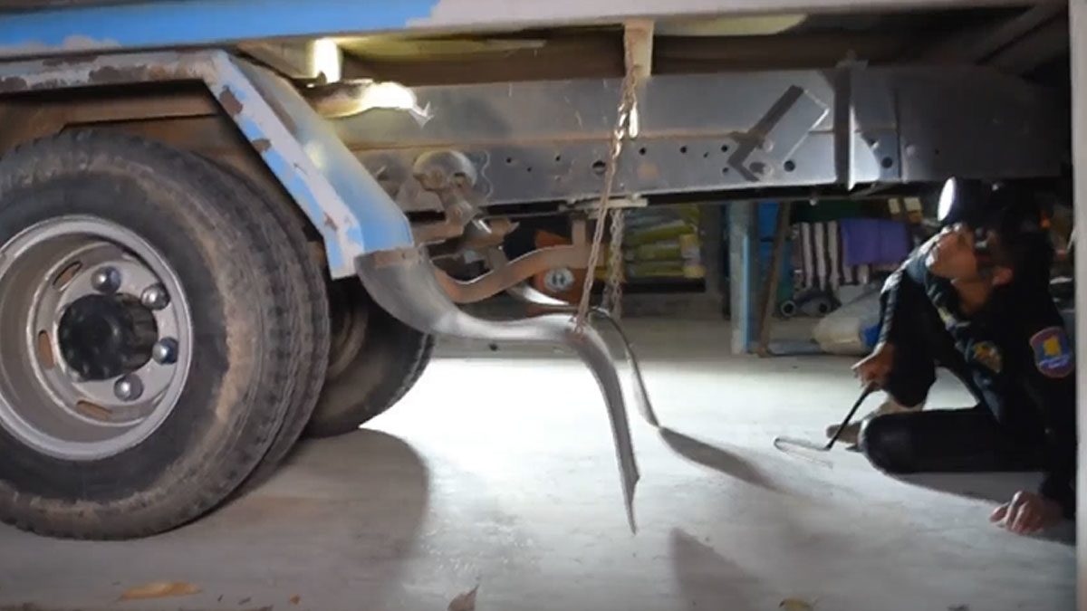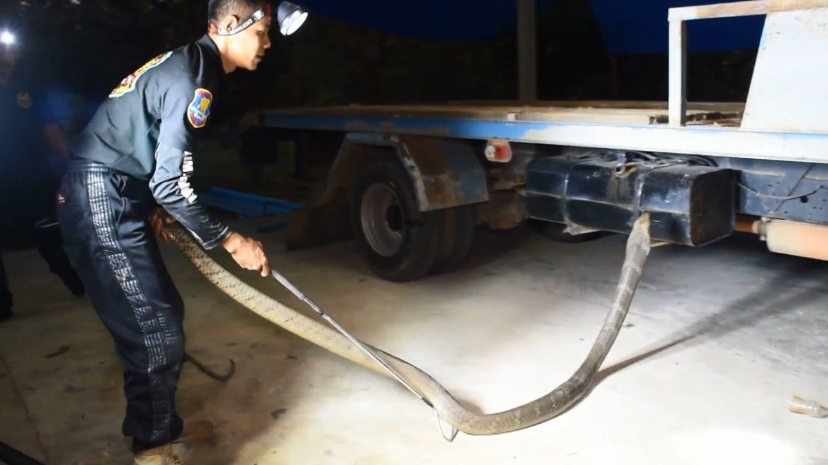 จงอางยักษ์ ซุกใต้ท้องรถ 6ล้อ กว่าจะจับได้ เลื้อยหลบ ส่งเสียงขู่ จะพุ่งฉกตลอดเวลา พบขนาดยาวกว่า 4 เมตร น้ำหนักประมาณ 15 กิโลกรัม