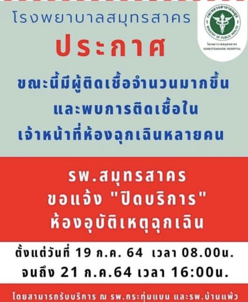 วันที่ 18 ก.ค.2564 สำนักงานประชาสัมพันธ์จังหวัดสมุทรสาคร ได้แจ้งประกาศ โรงพยาบาลสมุทรสาคร ประกาศปิดบริการห้องอุบัติเหตุฉุกเฉิน ตั้งแต่วันที่ 19 ก.ค.2564 เวลา 08.00 น. จนถึงวันที่ 21 ก.ค.2564 เวลา 16.00 น. เนื่องจาก ขณะนี้มีผู้ติดเชื้อจำนวนมากขึ้น และพบการติดเชื้อในเจ้าหน้าที่ห้องฉุกเฉินหลายคน