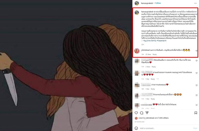 ฮารุ ยังโพสต์ภาพและข้อความดังกล่าวลงสตอรี่ พร้อมแท็กไอจีจำนวนมาก และติดแฮชแท็ก #guyharufamily ด้วย ขณะที่ เจนนิเฟอร์ คิ้ม เข้ามาคอมเมนต์ปรบมือ พร้อมทั้งบอกว่านอกจากจิตดีแล้ว…หนูเขียนหนังสือได้ดีมาก ขณะที่แฟนคลับเข้ามาคอมเมนต์ชื่นชอบพร้อมส่งกำลังใจจำนวนมาก อาทิ ทัศนคติแม่ดีมาก ครอบครัวก็น่ารัก ทีมงานก็ดี หลงที่สุดพี่เดน , อ่านแล้วชอบมากๆเลยค่ะ ขออนุญาตนำไปแชร์ต่อนะคะ , รักมี๊ เป็นกำลังใจให้นะคะ เป็นต้น
