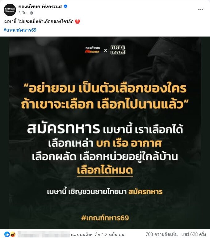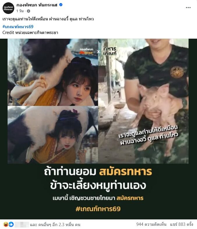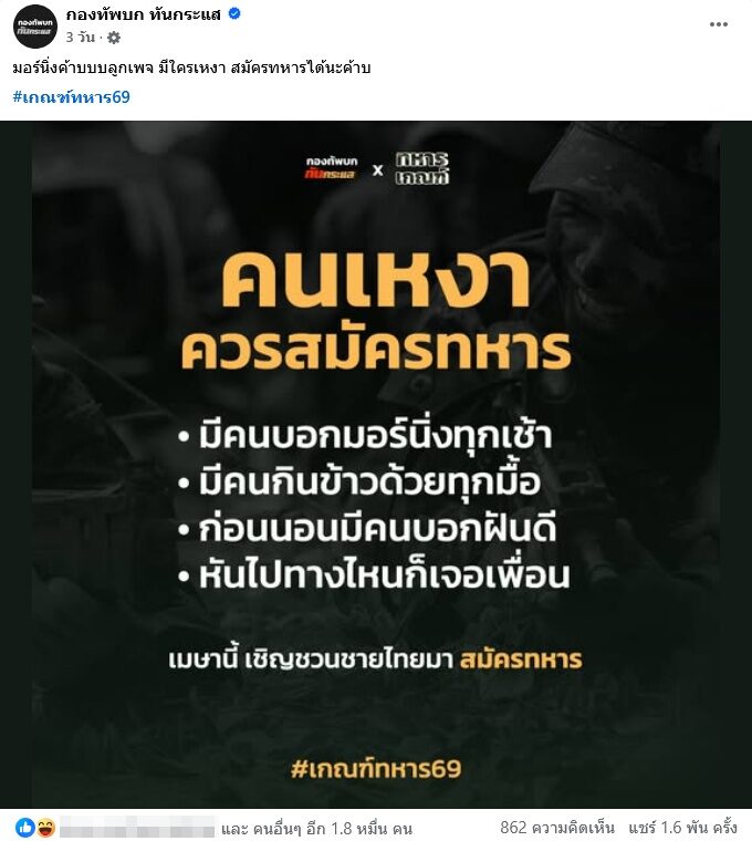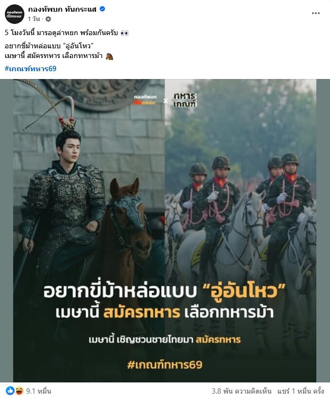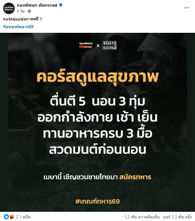 จากกรณีที่ เพจ กองทัพบกทันกระแส มักทําคอนเทนต์สร้างความฮือฮาเป็นที่พูดถึงในโซเชียล โดยเฉพาะช่วงนี้คอนเทนต์รณรงค์ชวนชายไทยไปสมัครเป็นทหารเดือนเมษายนนี้ คอนเทนต์เรียกทั้งกระแสไลก์กระแสแชร์และคอมเมนต์กันสนั่นมากๆ