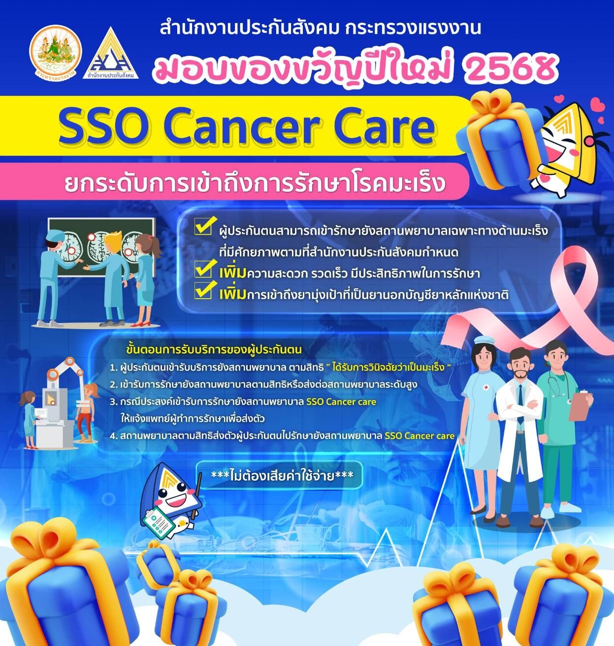 “จะเห็นได้ว่าการเพิ่มสิทธิประโยชน์ที่ผู้ประกันตนจะได้รับจากโครงการ SSO Cancer Care ประมาณ 100,000 คน/ปี มีสถานพยาบาลที่ทำความตกลงดูแลรักษาโรคมะเร็งเพิ่มมากขึ้น ส่งผลให้ผู้ประกันตนสามารถเข้าถึงบริการได้มากยิ่งขึ้น อีกทั้งผู้ประกันตนสามารถเข้ารับการรักษาโดยไม่มีค่าใช้จ่าย สปส. มีความมุ่งมั่นพัฒนาสิทธิประโยชน์ด้านการรักษา เพื่อดูแลสุขภาพของผู้ประกันตนให้มีคุณภาพชีวิตที่ดี สามารถทำงานได้อย่างมีประสิทธิภาพช่วยเป็นแรงขับเคลื่อนในการพัฒนาประเทศ ผู้ประกันตนสามารถสอบถาม เพิ่มเติมได้ที่สำนักงานประกันสังคมจังหวัด/สาขา ทุกแห่งทั่วประเทศ หรือโทร.สายด่วน 1506 (เจ้าหน้าที่ให้บริการ ทุกวันตลอด 24 ชั่วโมง)” เลขาธิการ สปส. กล่าว