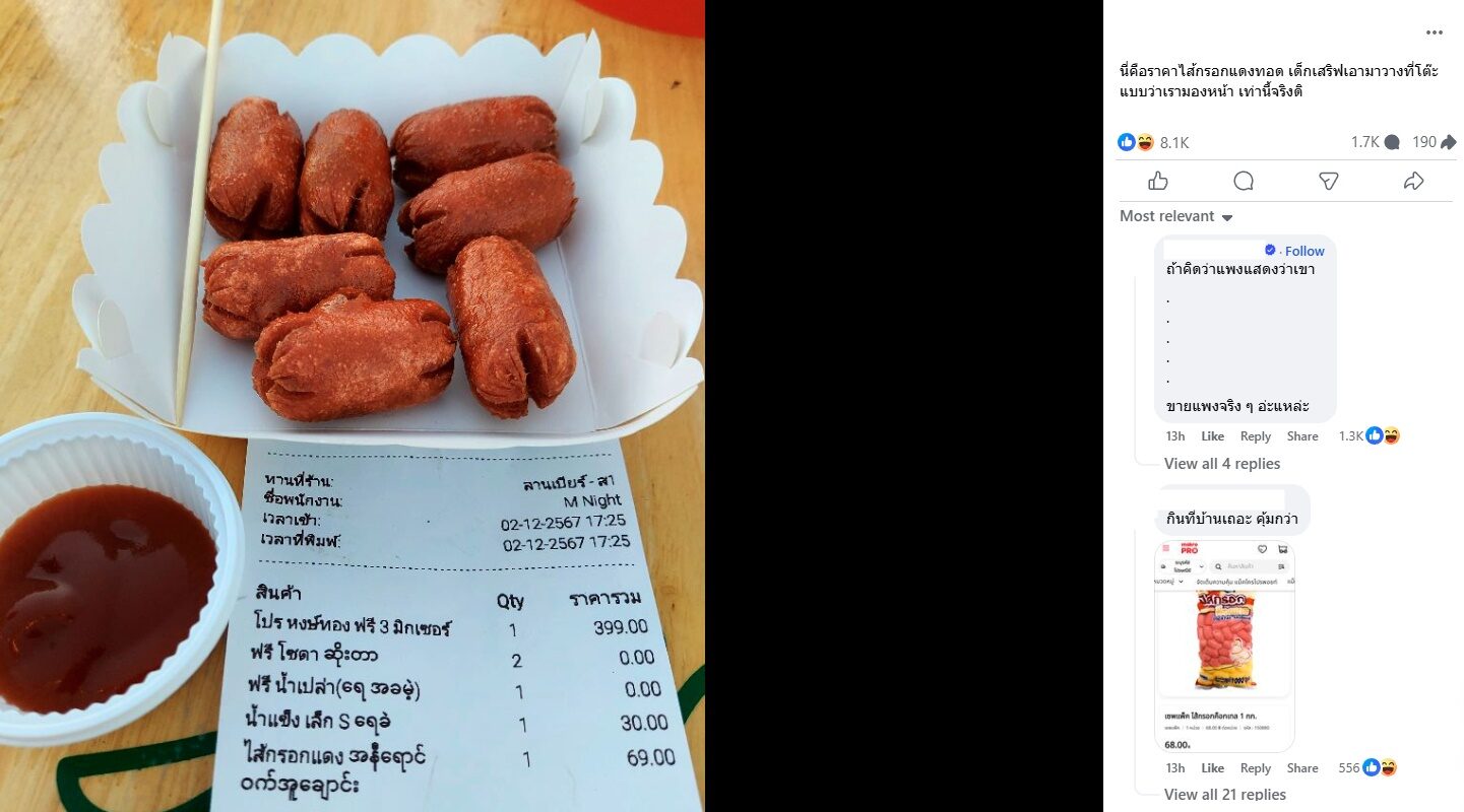 โดยผู้โพสต์ไส้กรอกแดงทอด 7 ชิ้น ในราคา 69 บาท พร้อมใบเสร็จ และเขียนข้อความ ระบุว่า นี่คือราคาไส้กรอกแดงทอด เด็กเสิร์ฟเอามาวางที่โต๊ะแบบว่าเรามองหน้า เท่านี้จริงดิ