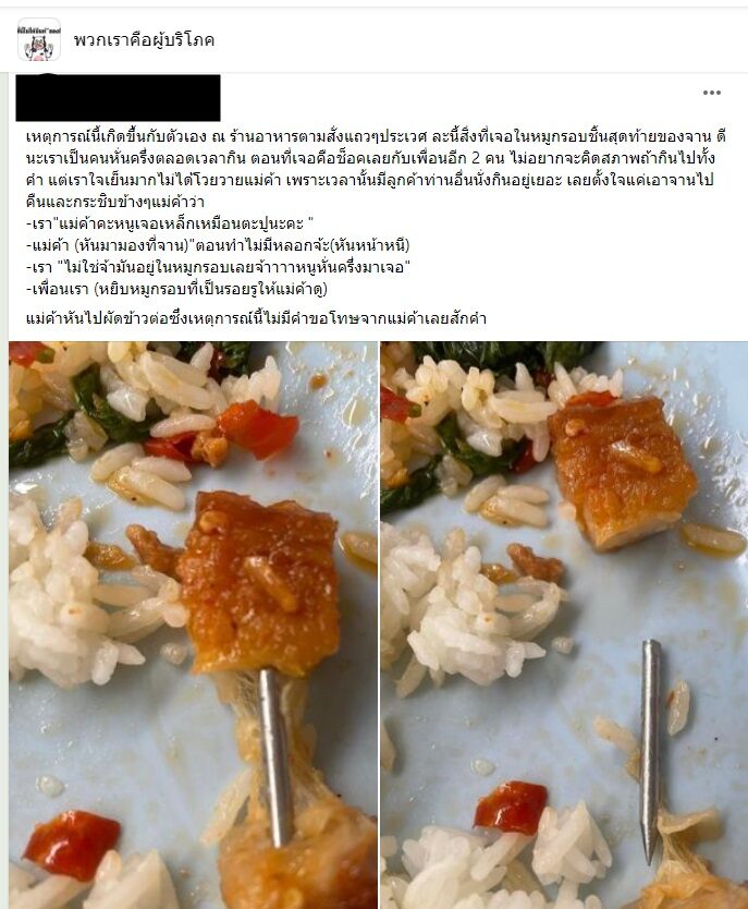 สาวรายหนึ่ง โพสต์ข้อความลงในกลุ่มพวกเราคือผู้บริโภคว่า ซื้อข้าวในร้านอาหารตามสั่งแห่งหนึ่ง และพบว่ามีเหล็กลักษณะคล้ายตะปูอยู่ในหมูกรอบ โดยเธอเขียนข้อความ ระบุว่า เหตุการณ์นี้เกิดขึ้นกับตัวเอง ณ ร้านอาหารตามสั่งแถวๆประเวศ