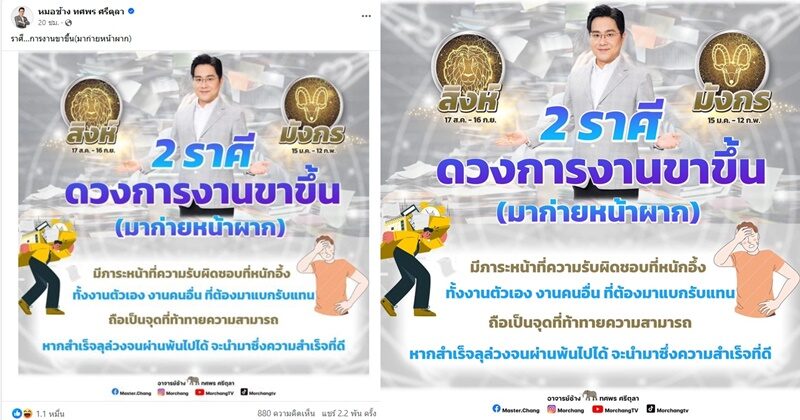 หมอช้าง ทศพร โพสต์ถึงดวงเรื่องการงานว่า ““ราศี…การงานขาขึ้น(มาก่ายหน้าผาก)” 2 ราศี มีภาระหน้าที่ความรับผิดชอบที่หนักอึ้ง