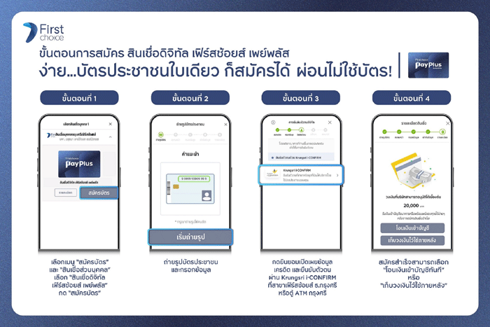 ผู้ที่สนใจสามารถสมัครได้ง่ายๆ เพียงดาวน์โหลดแอป UCHOOSE เลือกเมนู “สมัครบัตร”>> กดเลือก “สินเชื่อส่วนบุคคล” >> กด “สินเชื่อ เฟิร์สช้อยส์ เพย์พลัส” >> กด “สมัคร” >> จากนั้นสแกนบัตรประชาชนและกรอกข้อมูล>> แล้วกดยินยอมเปิดเผยข้อมูลเครดิต และยืนยันตัวตนผ่าน Krungsrii-CONFIRM ที่สาขากรุงศรีเฟิร์สช้อยส์ หรือที่ตู้เอทีเอ็มหรือสาขาของธนาคารกรุงศรีอยุธยา ทราบผลอนุมัติไว รับเงินโอนเข้าบัญชีหรือพร้อมเพย์ได้ทันทีหลังการอนุมัติพร้อมทำรายการเบิกถอนเงินสดได้ด้วยตัวเองในแอป UCHOOSE หรือทำรายการผ่อนชำระ โดยสแกน QR Code จากร้านค้าผ่านแอป UCHOOSE เพื่อทำรายการผ่อนไม่ใช้บัตรณ ร้านค้าที่ร่วมรายการเลือกผ่อนชำระได้นานสูงสุด 5 เดือน (เงื่อนไขเป็นไปตามที่บริษัทกำหนด) ข้อมูลเพิ่มเติม https://bit.ly/firstchoice-payplus
