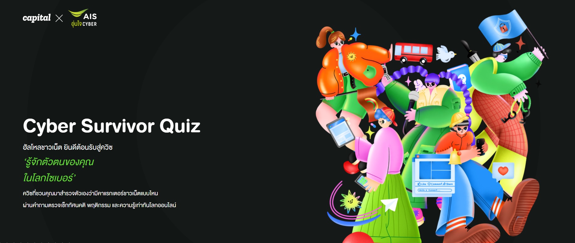 มาในปี 2023 เอไอเอสยังคงหา วิธีการสื่อสารใหม่ ๆ และในครั้งนี้ก็มาในรูปแบบการทำ Quiz เพื่อหา ตัวตนบนโลกออนไลน์ โดยเป็นการร่วมกับ Capital สื่อออนไลน์ชื่อดังภายใต้โปรเจกต์ Cyber Survivor ซึ่งใน Quiz ก็เหมือนเป็นการ สอนให้รู้เท่าทันไซเบอร์ แบบเนียน ๆ รวมถึงยังเป็นเหมือนการ เตือนสติ ผ่าน 5 คาแรกเตอร์