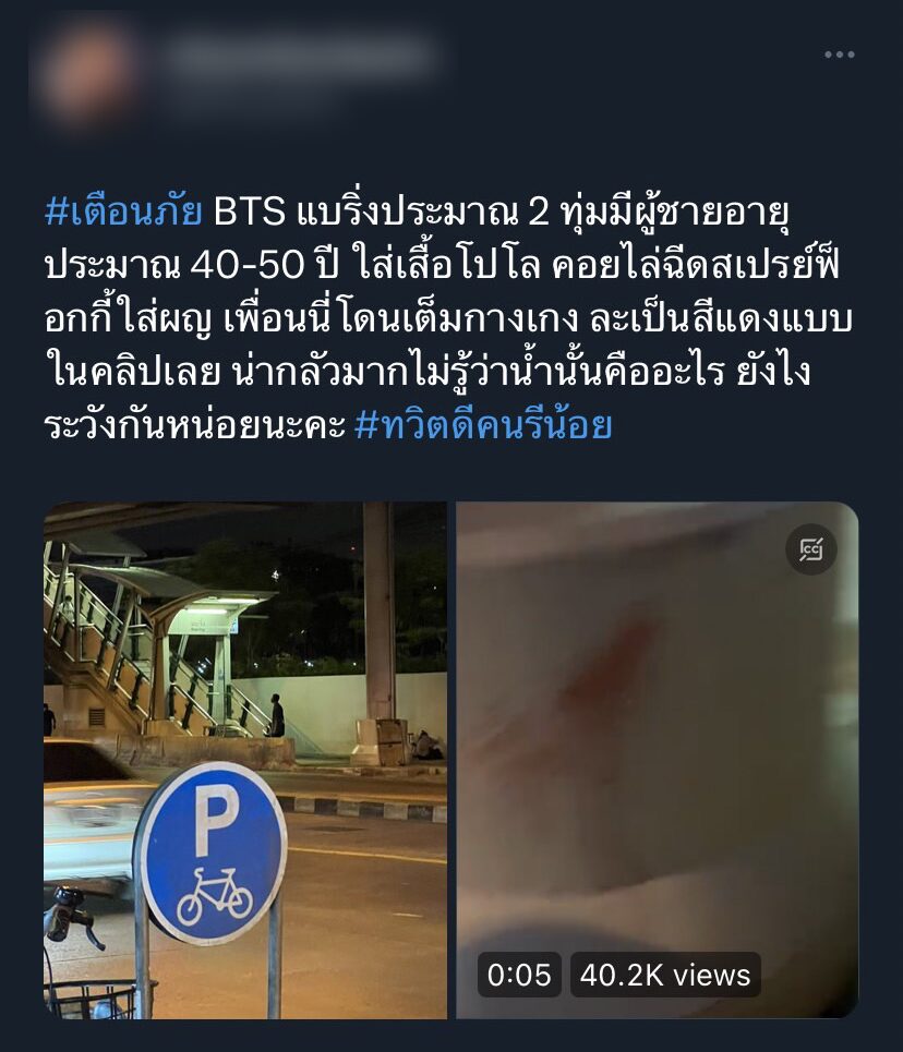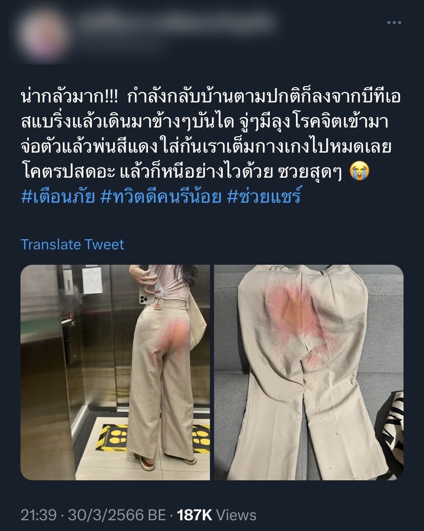 เมื่อวันที่ 30 มี.ค. 66 มีผู้ใช้บัญชีทวิตเตอร์ท่านหนึ่งออกมาโพสต์เตือนภัยว่า "น่ากลัวมาก!!! กำลังกลับบ้านตามปกติ ก็ลงจากบีทีเอสแบริ่งแล้วเดินมาข้างๆบันได จู่ๆมีลุงโรคจิตเข้ามาจ่อตัวแล้วพ่นสีแดงใส่ก้นเราเต็มกางเกงไปหมดเลย โคตรประสาทแดกอะ แล้วก็หนีอย่างไวด้วย ซวยสุดๆ"