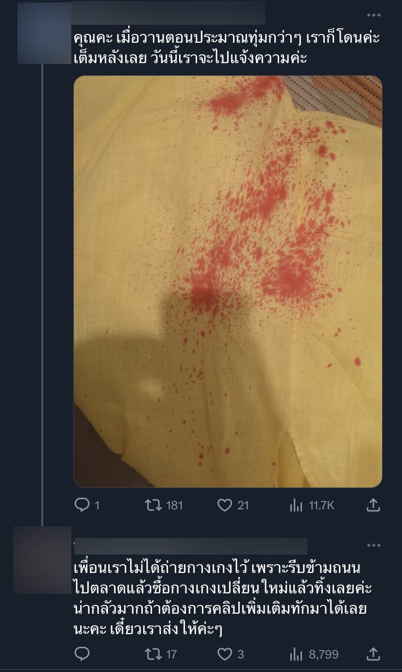 โดยต่อมา วันที่ 1 เม.ย. 66 ก็มีผู้ใช้บัญชีทวิตเตอร์ออกมาเตือนภัยอีกเช่นกัน โดยโดนกระทำในลักษณะเดียวกัน คือเจอชายโรคจิตคอยไล่ฉีดสเปรย์สีแดงใส่ผู้หญิง ซึ่งเธอก็ไม่ทราบว่าน้ำสีแดงดังกล่าวนั้นคือน้ำอะไร เพราะถูกบรรจุใส่ในฟ็อกกี้ฉีดน้ำ