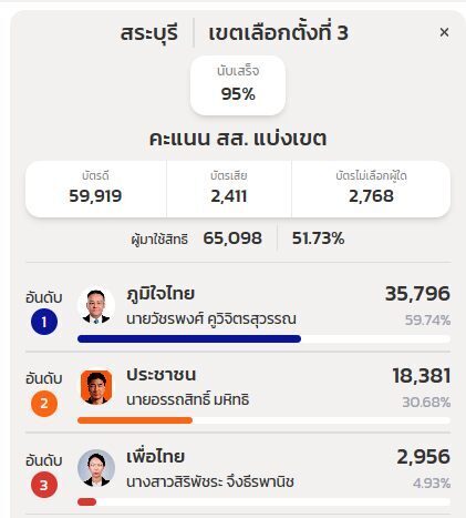 จากการตรวจสอบเว็บไซต์รายงานผลของ กกต. https://ectreport69.ect.go.th/overview กรณี จ.สระบุรี เขตเลือกตั้งที่ 3 รายงานผลเลือกตั้งที่นับเสร็จแล้ว 95%