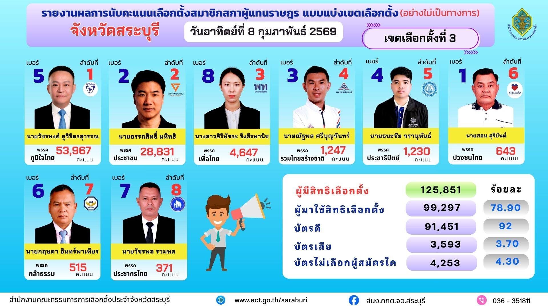 ต่อมา สำนักงานคณะกรรมการการเลือกตั้ง จังหวัดสระบุรี มีการทำกราฟิกสรุปผลการนับคะแนนทั้ง 4 เขต แบบ 100% โดยคะแนนในเขต 3 อันดับ 1 นายวัชรพงศ์ คูวิจิตรสุวรรณ 53,967 คะแนน อันดับ 2 นายอรรถสิทธิ์ มหิทธิ 28,831 คะแนน โดยระบุมีผู้มาใช้สิทธิ 99,297 คน บัตรดี 91,451 ใบ บัตรเสีย 3,593 ใบ บัตรไม่เลือกผู้ใด 4,253 ใบ