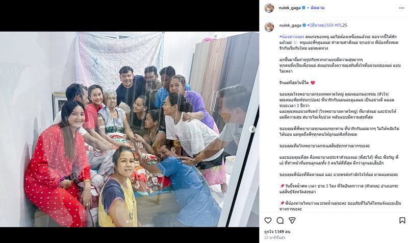 “และขอบคุณที่สุด คือพยาบาลประจำตัวของแม่ (พี่สะใภ้) พี่นะ พี่ขวัญ พี่เอ๋ ที่ทำหน้าที่แทนลูกแม่ทั้ง 8 คนได้ดีที่สุด ดีกว่าลูกแม่เสียอีก