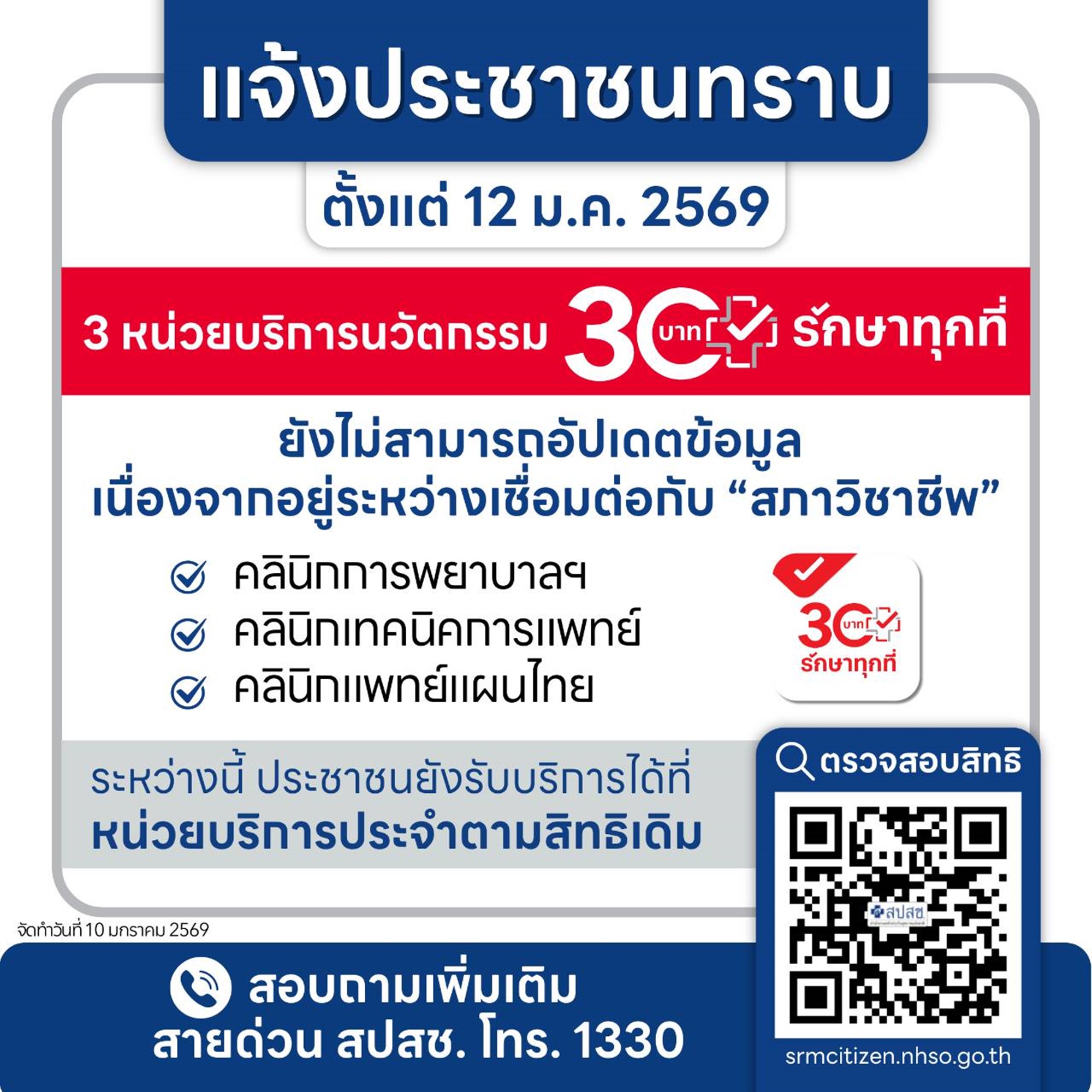 สปสช. เปิดขั้นตอน “ทางเลือกเสริมบัตรทอง” เข้ารับบริการ 30 บาทรักษาทุกที่ ที่ร้านยา-คลินิกเอกชน แนวทางใหม่ เริ่มแล้ววันนี้ (12 ม.ค. 69) เน้นย้ำพัฒนาระบบยืนยันตัวตนด้วยใบหน้า-QR Code-มีระบบโควตารายสัปดาห์ ใช้ได้ทั้งแบบวอล์กอินหรือจองคิวล่วงหน้าผ่าน LINE