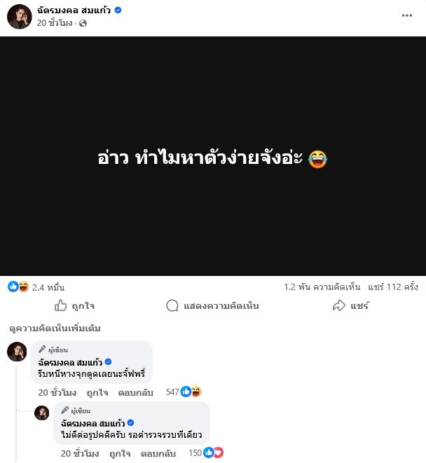 ก่อนจะโพสต์เหมือนเจอตัวแล้วว่า “อ่าว ทำไมหาตัวง่ายจังอ่ะ” พร้อมทั้งบอกด้วยว่ารอตำรวจรวบทีเดียว ยิว ยังโพสต์เดือดด้วยว่า “ที่หมั่นไส้คือมาตั้งค่าว่า เกรดยิว เกรดเจนนี่ แหม่ ไอสูงส่ง ฟันอย่างเหลือง ”