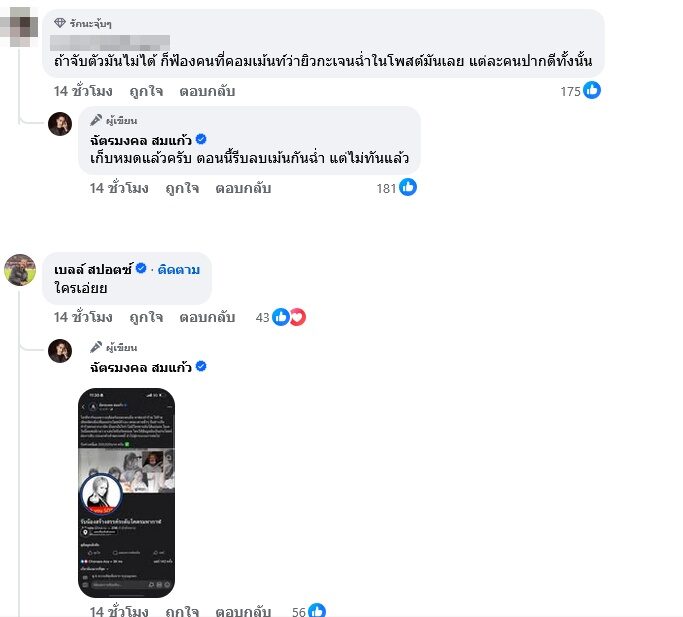 ขณะที่มีคนเข้ามาคอมเมนต์สนับสนุนว่า “ถ้าจับตัวมันไม่ได้ ก็ฟ้องคนที่คอมเมนท์ว่ายิวกะเจนฉ่ำในโพสต์มันเลย แต่ละคนปากดีทั้งนั้น” โดย ยิว ก็ได้คอมเมนต์ตอบด้วยว่า “เก็บหมดแล้วครับ ตอนนี้รีบลบเม้นต์กันฉ่ำ แต่ไม่ทันแล้ว”