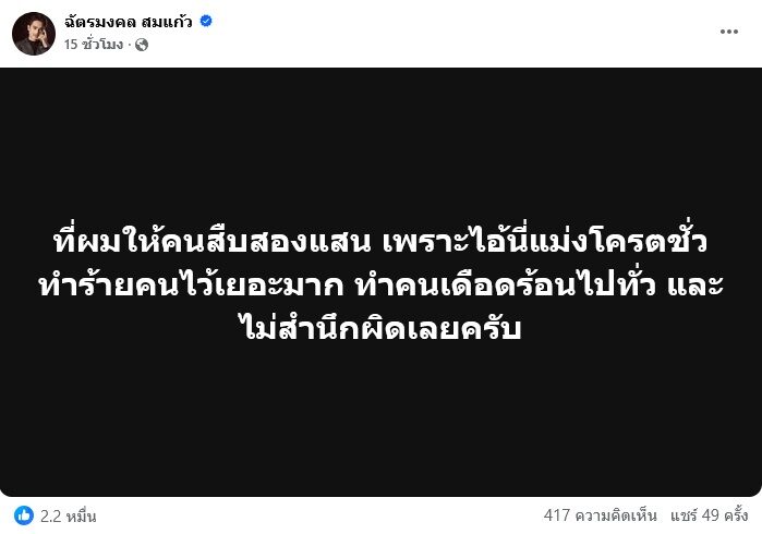 ทั้งนี้ ยิว ยังโพสต์ล่าสุดด้วยว่า “ที่ผมให้คนสืบสองแสน เพราะไอ้นี่แม่งโคตรชั่ว ทำร้ายคนไว้เยอะมาก ทำคนเดือดร้อนไปทั่ว และไม่สำนึกผิดเลยครับ”