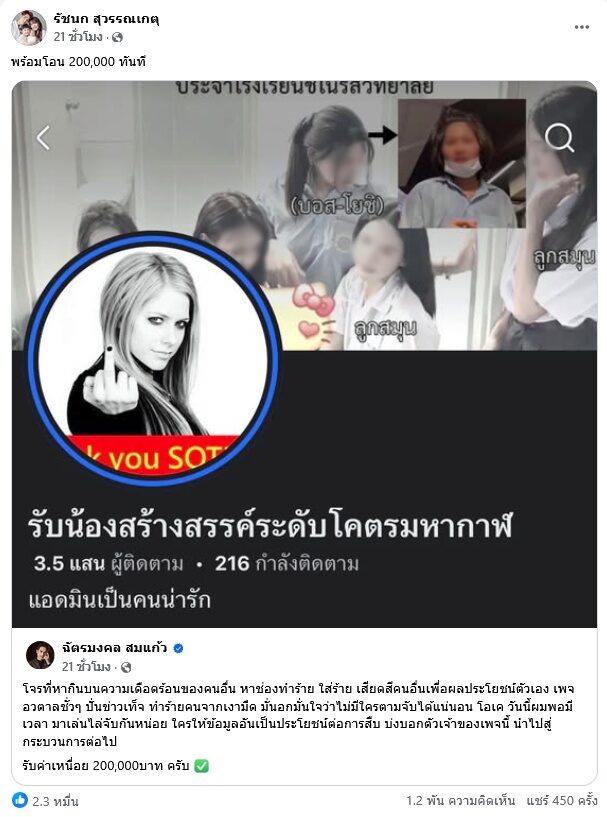 ยิว ฉัตรมงคล หลังประกาศไล่จับแอดมินเพจหนึ่งที่คอยตามโพสต์ด่า เจนนี่ ได้หมดถ้าสดชื่น ภรรยาและตัวเอง และมีผู้เสียหายอีกหลายราย โดย ยิว ตั้งรางวัลคนให้เบาะแส 2 แสนบาทเลยในการไล่จับ