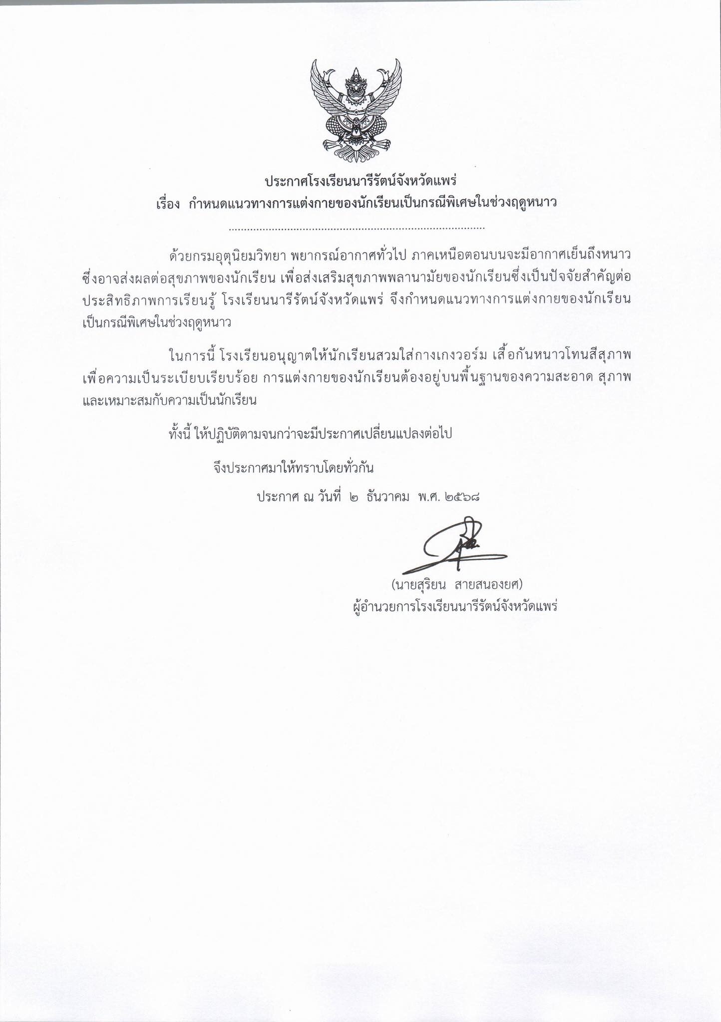 ล่าสุด โรงเรียนนารีรัตน์จังหวัดแพร่ โรงเรียนชื่อดังของจังหวัดแพร่ ออกประกาศเรื่อง กำหนดแนวทางการแต่งกายของนักเรียนเป็นกรณีพิเศษในช่วงฤดูหนาว ลงวันที่ 2 ธ.ค. ความว่า ด้วยกรมอุตุนิยมวิทยา พยากรณ์อากาศทั่วไป ภาคเหนือตอนบนจะมีอากาศเย็นถึงหนาว ซึ่งอาจส่งผลต่อสุขภาพของนักเรียน เพื่อส่งเสริมสุขภาพพลานามัยของนักเรียน ซึ่งเป็นปัจจัยสำคัญต่อประสิทธิภาพการเรียนรู้ โรงเรียนนารีรัตน์จังหวัดแพร่ จึงกำหนดแนวทางการแต่งกายของนักเรียนเป็นกรณีพิเศษในช่วงฤดูหนาว