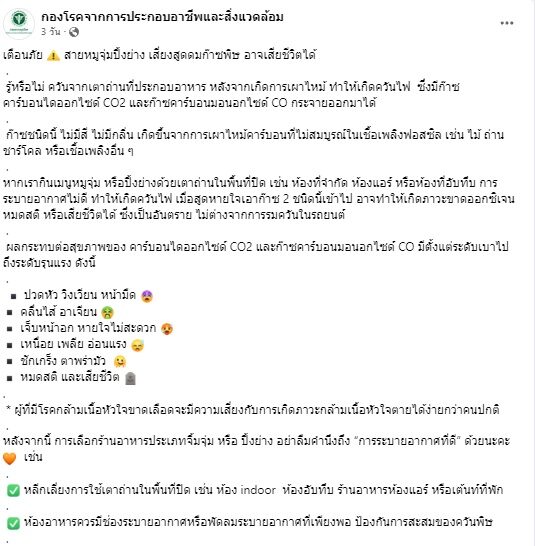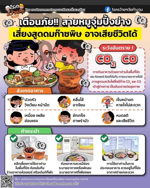ล่าสุดทางเพจ "กองโรคจากการประกอบอาชีพและสิ่งแวดล้อม" ได้ออกมาเตือนภัย สายหมูจุ่มปิ้งย่าง เสี่ยงสูดดมก๊าซพิษ อาจเสียชีวิตได้