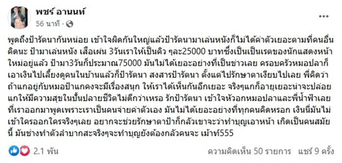 เกิดอะไรขึ้น พชร์ อานนท์ ออกมาโพสต์ข้อความชี้แจงที่มีคนเข้าใจผิดถึงเงินค่าตัวที่ให้ ป้ารัตนา ตอนมาเล่นหนัง เสือเผ่น และเงินดังกล่าวเอาไปทำอะไร โดยสงสาร ป้ารัตนา อยากให้ปล่อยให้มีความสุขในบั้นปลายชีวิต