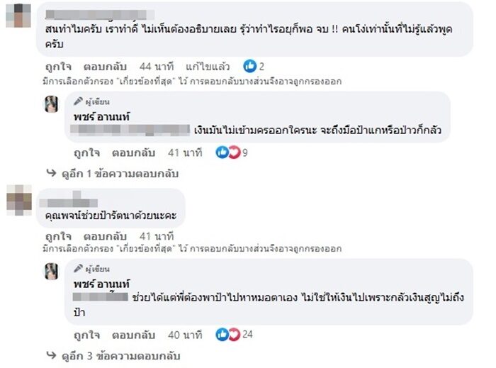 บ้างก็เข้ามาบอกว่า “สนทำไมครับ เราทำดี ไม่เห็นต้องอธิบายเลย รุ้ว่าทำไรอยุก็พอ จบ !! คนโง่เท่านั้นที่ไม่รู้แล้วพูดครับ” พชร์ ก็ตอบว่า “เงินมันไม่เข้าใครออกใครนะ จะถึงมือป้าแกหรือป่าวก็กลัว” เป็นต้น
