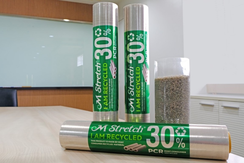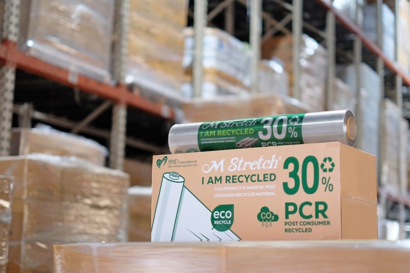 ทางเลือกใหม่ของธุรกิจนำเข้าส่งออก ฟิล์มยืดพันสินค้า “รักษ์โลก” เอ็มเอ็มพีฯ พัฒนาต่อยอดนวัตกรรมใหม่ ฟิล์มยืดพันสินค้า ภายใต้แบรนด์ “M Stretch” (เอ็ม เสตรช) ที่มีส่วนผสมของเม็ดพลาสติกรีไซเคิล (Post - Consumer - Recycled resin : PCR) มากถึง 30% ซึ่งถือว่าเป็นสัดส่วนที่สูงที่สุดในตลาดตอนนี้ ตอบโจทย์ Circular Economy เศรษฐกิจหมุนเวียนในการใช้ทรัพยากรที่มีอยู่อย่างคุ้มค่า ซึ่งการผลิตฟิล์มยืดจากเม็ดพลาสติกรีไซเคิล PCR นั้น ต้องอาศัยความเชี่ยวชาญ และความชำนาญในการผลิตสูง เพื่อที่จะสามารถผลิตฟิล์มยืดจากเม็ดพลาสติกรีไซเคิลให้มีคุณภาพเทียบเคียงกับฟิล์มยืดที่ผลิตมาจากเม็ดพลาสติกใหม่ได้สำเร็จ อีกทั้งยังคงคุณสมบัติที่ดีของฟิล์มยืดพันสินค้า อาทิ ความใส ความแข็งแรง ความเหนียว ความยืดหยุ่น และการยึดเกาะสินค้า ให้สามารถขนส่งได้อย่างปลอดภัย ซึ่งมีทั้งแบบพันด้วยมือ และพันด้วยเครื่องจักร ตอบโจทย์ผู้ประกอบการทุกกลุ่มเป้าหมาย ทั้งในประเทศ และภาคการส่งออก พร้อมชูไทยเป็นต้นแบบ เพื่อวางแผนขยายการใช้งานฟิล์มพันสินค้าไปยังประเทศอื่นๆ โดยที่ผู้ประกอบการสามารถควบคุมต้นทุน ลดค่าใช้จ่าย แถมยังตั้งเป้าในการช่วยลดขยะพลาสติกได้มากกว่า 100 ตันต่อปีอีกด้วย
