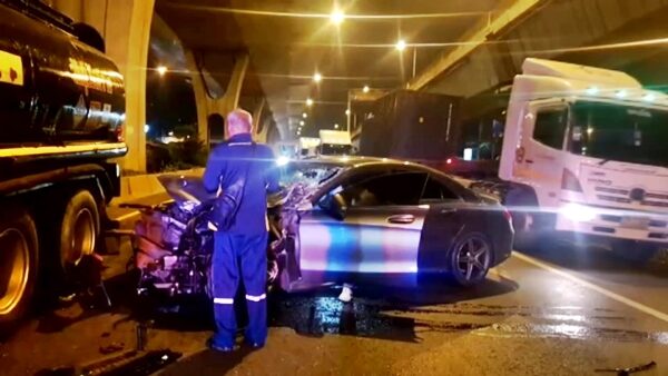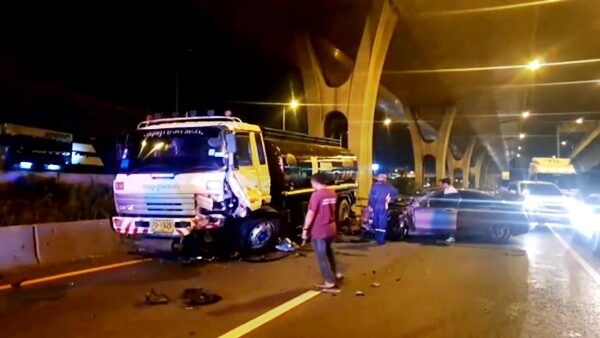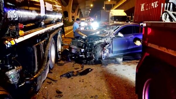 หนุ่มเมา ซิ่งเบนซ์ย้อนศร ในเลนทางด่วน พุ่งชนประสานงา10ล้อพังยับ