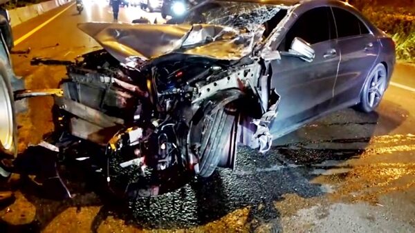 ที่เกิดเหตุพบรถยนต์ ยี่ห้อเมอร์เซเดสเบนซ์ ซีแอลเอ 250 ทะเบียน กรุงเทพมหานคร สภาพด้านหน้ารถพังเสียหายยับเยิน จอดขวางถนนอยู่ คนขับชื่อ นายธิติพงษ์ (ขอสงวนนามสกุล) อายุ 42 ปี