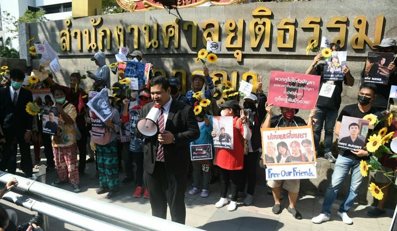 นายกิตติศักดิ์ กองทอง ทนายความของศูนย์ทนายความเพื่อสิทธิมนุษยชน แจ้งว่า วันนี้จะมีการยื่นเอกสารต่อศาลเพื่อขอประกันตัวนักโทษการเมืองจำนวน 12 คนเท่านั้น เนื่องจากอีก 4 คน คือ นายโสภณ สุรฤทธิ์ธำรง หรือ เก็ท, น.ส.ณัฐนิช ดวงมุสิทธิ์ หรือ ใบปอ, น.ส.ทานตะวัน ตัวตุลานนท์ หรือ ตะวัน และ น.ส.อรวรรณ ภู่พงษ์ หรือ แบม ไม่ประสงค์ที่จะยื่นขอประกันตัว สำหรับผลการพิจารณาของศาล จะต้องรอต่อจากนี้ว่าจะให้ประกันตัวตามที่ยื่นขอหรือไม่ จากนั้นทีมทนายความเข้ายื่นหนังสือขอประกันตัวกับศาลโดยมีมวลชนปักหลักรออยู่ด้านหน้า