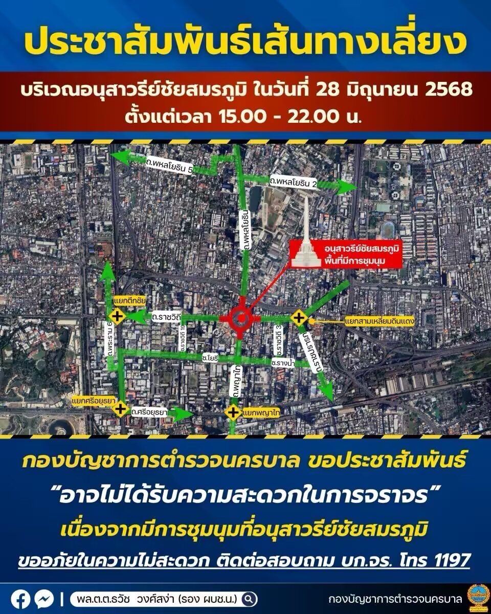 วันที่ 28 มิ.ย.2568 กองบัญชาการตำรวจนครบาล ( บช.น.) แจ้งประชาสัมพันธ์เส้นทางหลีกเลี่ยงบริเวณอนุสาวรีย์ชัยสมรภูมิ ตั้งแต่เวลา 15.00 - 22.00 น. เนื่องจากจะมี การชุมนุมบริเวณอนุสาวรีย์ชัยสมรภูมิ อาจส่งผลกระทบต่อการจราจรโดยรอบ ขอความร่วมมือประชาชนผู้ใช้รถใช้ถนน หลีกเลี่ยงเส้นทางตามจุดสำคัญ ดังนี้