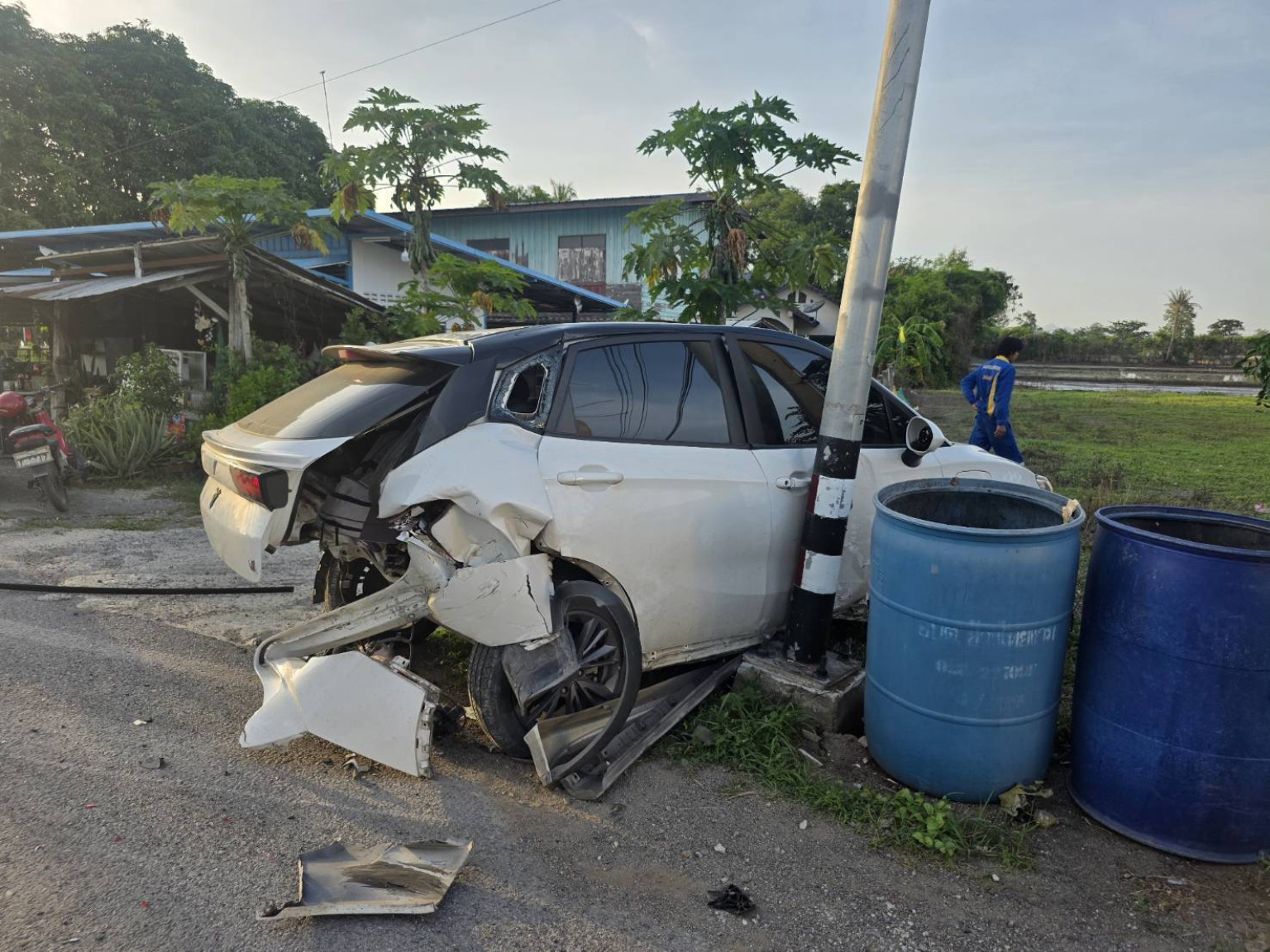 สลด!!รถยนต์ไฟฟ้าจอดซื้อน้ำแข็งริมถนนถูกกระบะตู้ทึบพุ่งชนอัดเสาไฟฟ้าดับบริเวณถนนสายห้วยบง-ท่าลาน