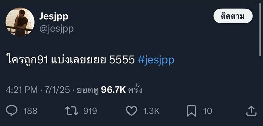 แล้วได้ซื้อไหม? “ไม่ได้ซื้อเพราะผมไม่คิดว่ามันจะถูก (แฟนๆ ถูกเยอะไหม?) ก็กำลังรอเงินแบ่งอยู่ (แสดงว่าถูกกันเยอะมาก?) เขาก็อยู่ในเอ็กซ์นั่นแหละพอเขาแชร์กันว่าสองตัวท้ายอันนี้ ผมก็แบบทะเบียนเราถูก เขาก็เหมือนแชร์คลิปที่ผมพูดเลขนี้ออกไป โอเคผมมีอะไรยืนยันแล้วว่าผมเป็นส่วนหนึ่งของการถูกหวยของทุกคน”