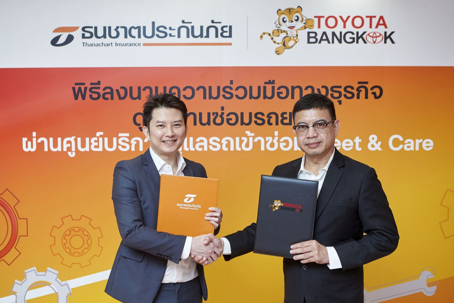 นายทีฆภัค ศรียุกต์วงศ์ รองประธานเจ้าหน้าที่บริหาร บริษัท ธนชาตประกันภัย จำกัด (มหาชน) กล่าวว่า “นับเป็นความร่วมมือครั้งสำคัญของสองบริษัทชั้นนำ เพื่อบรรลุวัตถุประสงค์ในโครงการ “ดูแลงานซ่อมรถยนต์ผ่านศูนย์บริการดูแลรถเข้าซ่อม Meet & Care” ด้วยการส่งมอบบริการเสริมพิเศษแก่ลูกค้าธนชาตประกันภัยที่ทำประกันภัยประเภทซ่อมอู่ สามารถนำรถยนต์ทุกยี่ห้อเข้ารับบริการจัดซ่อมที่ศูนย์บริการซ่อมรถยนต์ของโตโยต้าบางกอกได้ โดยไม่ต้องกังวลเรื่องค่าใช้จ่ายส่วนต่างค่าซ่อม พร้อมการรับประกันคุณภาพงานซ่อมที่ได้รับมาตรฐานสูงสุด และยังได้รับบริการพิเศษจากศูนย์บริการดูแลรถเข้าซ่อม Meet & Care จากธนชาตประกันภัย ที่ช่วยอำนวยความสะดวกให้ลูกค้า สามารถใช้บริการได้โดยไม่ต้องเสียค่าใช้จ่ายเช่นกัน