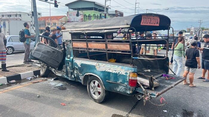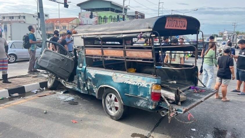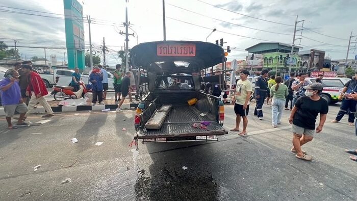 10 ล้อ อ้างเบรกไม่อยู่ ฝ่าไฟแดง พุ่งชนรถรับนักเรียน พังยับ เจ็บ7 สาหัส2