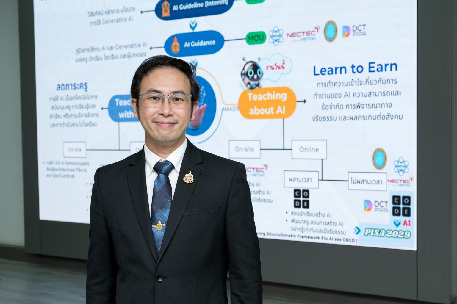 ดร.จีระพร สังขเวทัย ผู้อำนวยการสาขาเทคโนโลยี สถาบันส่งเสริมการสอนวิทยาศาสตร์และเทคโนโลยี(สสวท.) กล่าวว่า สสวท. ได้ริเริ่มการออกแบบหลักสูตรปัญญาประดิษฐ์ (AI) สำหรับการศึกษาขั้นพื้นฐาน ซึ่งประเทศไทยเป็นชาติแรก ๆ ในเอเชียที่มีหลักสูตร AI ในโรงเรียน โดยเริ่มดำเนินการตั้งแต่ปี 2567 ซึ่งมีแนวคิดสำคัญมาจาก แนวทาง AI4K12 และ AI Competency Framework for Students ขององค์การยูเนสโก (UNESCO) ทั้งสองแนวทางได้ถูกผนวกและปรับใช้เพื่อให้เหมาะสมกับระดับประถมศึกษาถึงมัธยมศึกษาตอนปลาย โดยมีเป้าหมายส่งเสริมให้นักเรียนเข้าใจเทคโนโลยี AI อย่างถูกต้อง สามารถใช้งานได้จริง และตระหนักถึงจริยธรรมและผลกระทบของ AI ต่อสังคม ซึ่งโครงสร้างหลักสูตรของระดับประถมศึกษา และมัธยมศึกษา มีความใกล้เคียงกัน อาจมีการปรับเปลี่ยนบางโมดูล เพื่อให้เหมาะสมกับระดับชั้นปี โครงสร้างหลักสูตรประกอบด้วย 5 โมดูล ตั้งแต่ประวัติศาสตร์ AI ไปจนถึงเทคนิค Supervised Learning การประมวลผลภาษาธรรมชาติ (NLP) และคอมพิวเตอร์วิชัน (Computer Vision) พร้อมทั้ง Generative AI เพื่อปลูกฝังความคิดสร้างสรรค์อย่างรับผิดชอบ