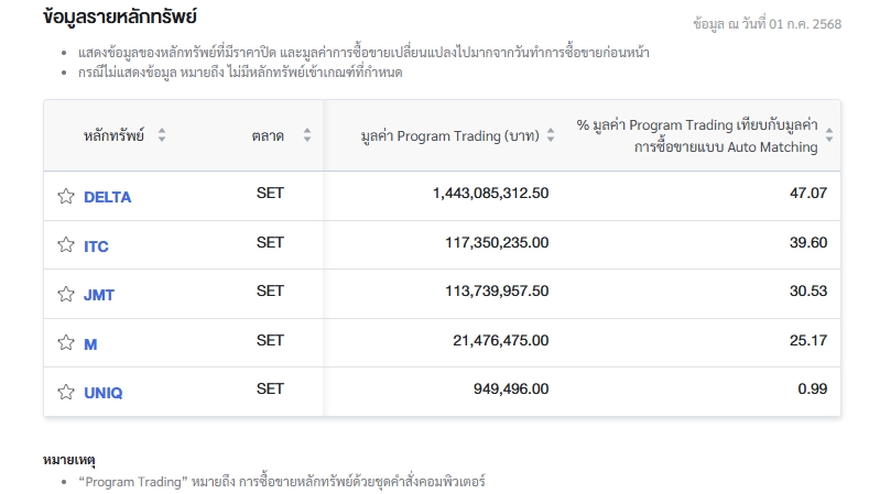 นอกจากนี้ ตลท.ยังรายงานข้อมูลหลักทรัพย์ที่ใช้ Program Trading ซื้อขายสูงสุด 5 อันดับ โดยเรียงจากเปอร์เซ็นต์ (%) มูลค่า Program Trading เทียบกับมูลค่าการซื้อขายแบบ Auto Matching ดังนี้
